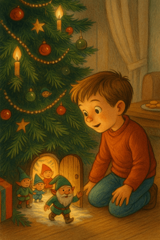 Az anya csak legyintett, de Dani kíváncsisága nem hagyta nyugodni. Letérdelt a fa mellé, és óvatosan félrehúzta az aranyszínű boát. Ott, a fenyő tűlevelei között egy apró ajtót fedezett fel. Nem volt nagyobb, mint egy könyvborító, és halványan világított.